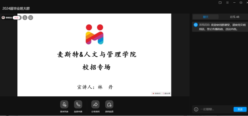 为拓宽我校毕业生就业渠道,把握优质就业岗位,进一步推动和提升学生就业质量,5月11日,人文与管理学院成功举办2024年线上就业双选会,毕业班辅导员、全体2024届毕业班学生共同参会。