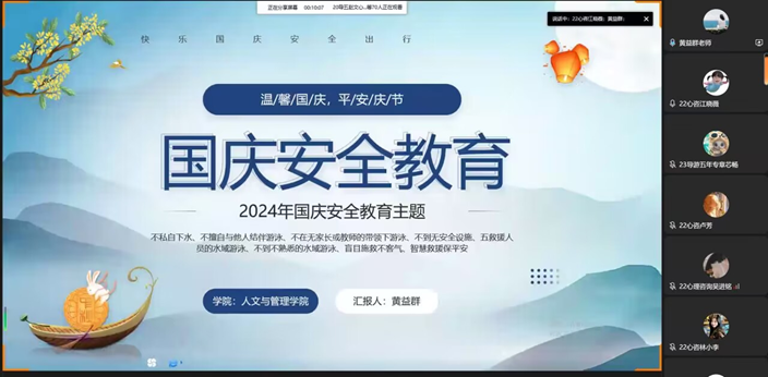 随着国庆长假的临近,为进一步增强学生安全意识,切实保障学生的假期安全,9月28日,人文与管理学院组织开展了国庆假期安全教育主题活动。本次活动由各辅导员主讲,线上线下同步进行。