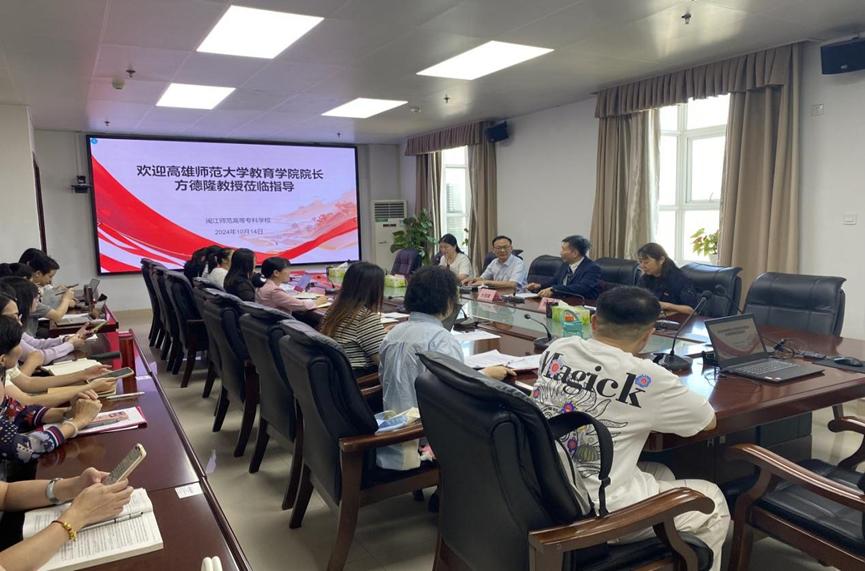 2024年10月14日,我校“海峡两岸心理服务融合发展交流会”在旗山校区明德楼第一会议室成功举行。高雄师范大学教育学院院长方德隆教授作为特邀嘉宾参加了本次会议。会议由教务处处长葛思华主持,副校长陈强教授、人文与管理学院院长陈勤等出席。我校心理健康教育资源库参建教师、小学教育学院、学前教育学院、外语商贸学院教师代表共同参与了此次交流,旨在深化两岸在心理健康教育领域的合作,促进资源共享,共同提升心理健康教育水平。
