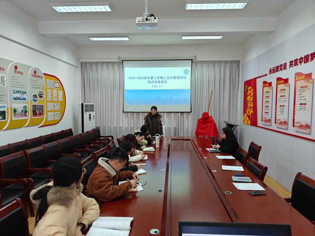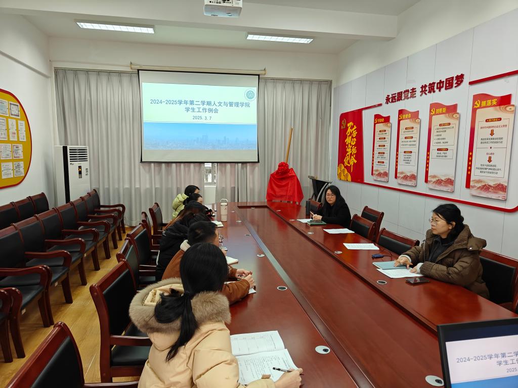 3月7日,人文与管理学院于3-301B会议室召开2024-2025年第二学期第四次学工例会,院党总支副书记陈清芬、全体辅导员参会,会议由院团委书记黄益群主持。