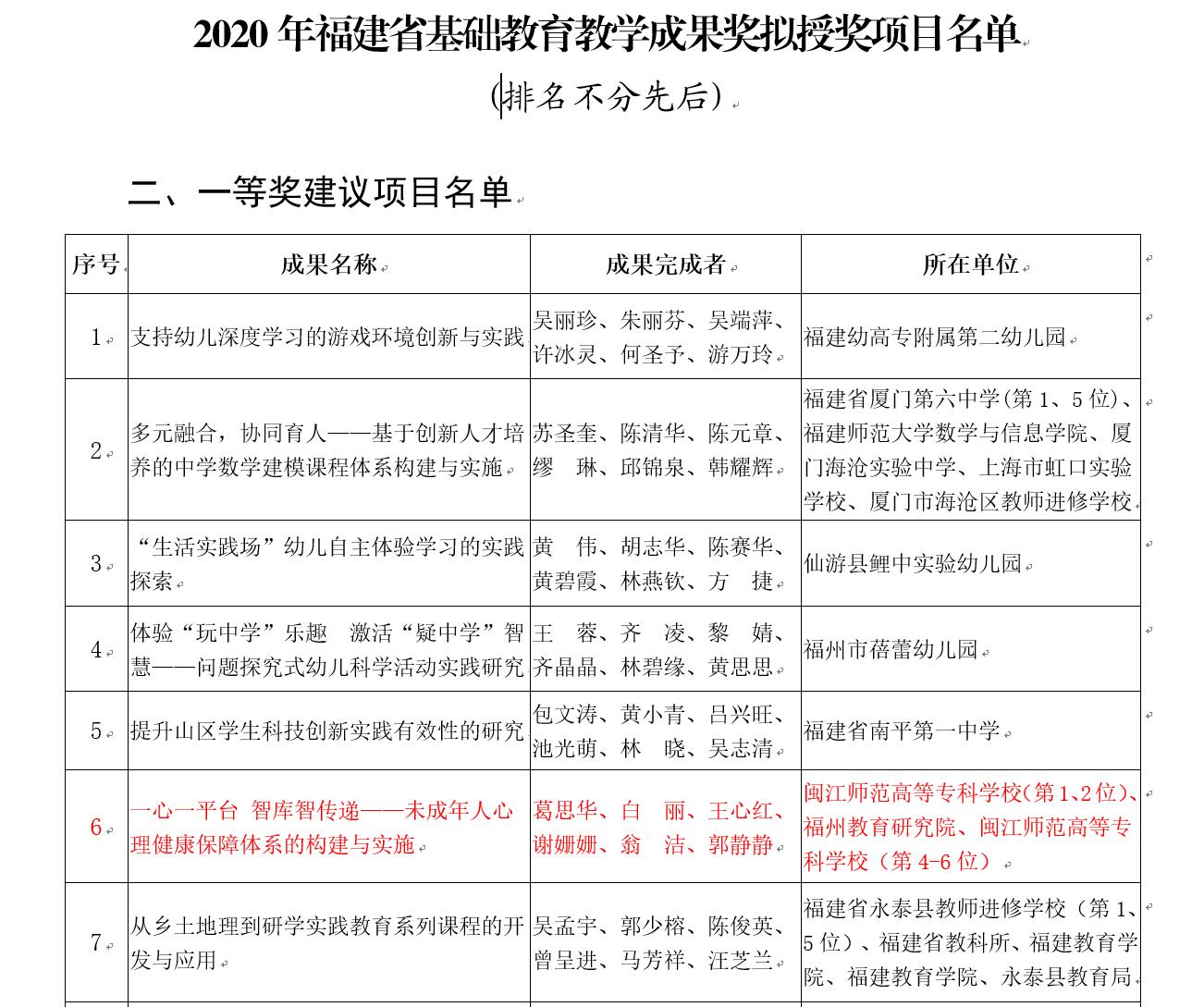 近日,福建省教育厅公布的《2020年福建省基础教育教学成果奖拟授奖项目名单》中,我校心理咨询专业申报的《一心一平台智库智传递》项目喜获一等奖。