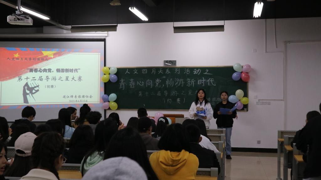 4月15日晚,第十二届导游之星大赛初赛在仓山校区3号404教室成功举办。出席本次活动的有人文社科系导游专业刘佳玲老师、邓婕老师、陈少霞老师、叶懿蛟老师及来自19导游、20导游1、20导游2和17导游五年专的同学,本次导游之星大赛的初赛由19导游熊淑雅和20导游张小梅主持。