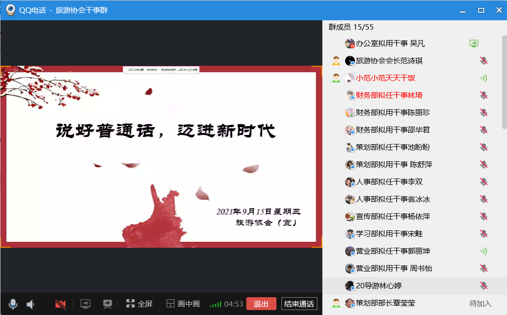 2021年9月15日晚上,人文社科系导游专业成功开展“说好普通话,迈进新时代”为主题的线上活动,此次活动由20级导游郭丽坤主持,旅游协会全体成员、导游专业同学参与了此次活动。