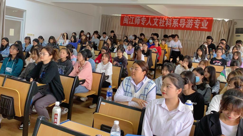 2021年10月29日下午,在闽江师范高等专科学院海口校区成功举办“研学行业发展现状与未来趋势”讲座,本次讲座由闽江师范高等专科学校人文社科系旅游协会主办,导游教研室有幸邀请到福建农业职业技术学院“三创”学院副院长黄俊波先生莅临本校进行演讲,同时人文社科系王颖秋老师与本校21级导游专业的全体同学也参与了本次专业认知讲座。