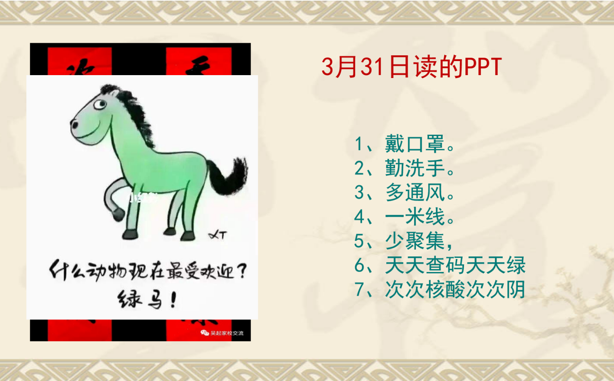 开课前一天,邱老师为确保网课顺利进行,召集选修课班委与组长对线上课程的设备进行了调试。24日下午课程正式开始,首先邀请了各组同学朗读上节课所学习的福州方言,同学们积极配合开麦发言,邱老师对同学们的表现进行点评,并集体复习了上节课的知识。邱老师结合当下疫情实际,嘱咐同学们要做好疫情防控,并讲授了与其有关的福州方言,如:“戴口罩”、“多通风”,“少聚集“等,又结合中华传统文化对联的教学,教了一副诙谐的对联:“天天查码天天绿”、“次次核酸次次阴”。随后邱老师介绍了福州市非遗项目“福州三宝”(牛角梳,油纸伞,脱胎漆器)及寿山石的特色和历史文化,带领同学们学习有关福州三宝的福州方言。课堂上,邱老师请同学们开麦跟读,邀请个别同学单独朗读。最后,邱老师对于此节课内容进行总结并布置课后作业,还特别制作了一段抖音视频在网上发布,便于同学课后复习,巩固。