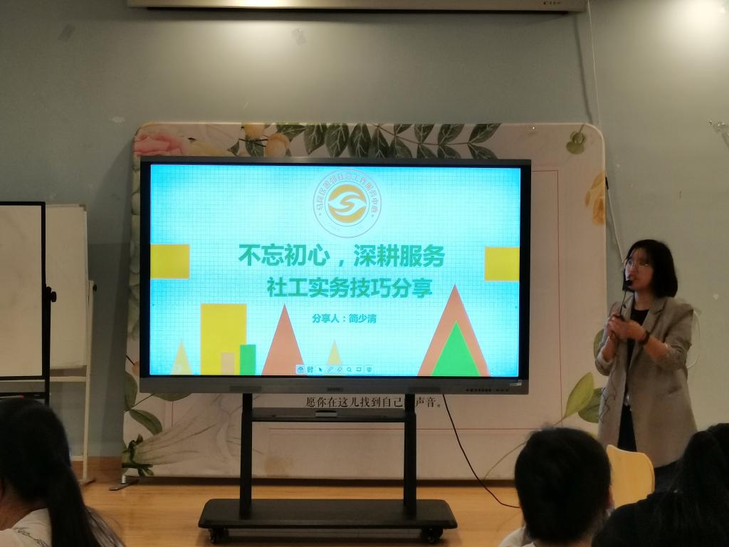 首先,简主任用一个简单却有趣的破冰小游戏“我有你没有”与在场的同学们迅速拉近距离,同学们在游戏中也很活跃,纷纷举手发言。在欢乐的气氛中,简老师讲述了几个社区工作的案例,并邀请同学们进行情景演绎,近距离的与同学们分享在社工实务中的与服务对象拉近距离与入户探访的经验,通过案例真实的反映了社区服务中存在的问题,这也是同学们开展实训时可能会接触的一部分。工作坊最后,简主任给同学们展现了社区服务的项目内容,讲述社工进入社区后所做的点点滴滴,如何让社区越来越好,让社区居民对社区服务中心产生认可,从而扎根社区服务,深入人群。