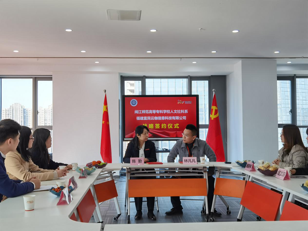 为更好地培养高素质、高技能的应用型人才,为学生提供更多的实习、实训机会。11月26日,人文社科系副主任(主持工作)陈勤带领人文社科系副书记陈清芬、副主任刘少艾、管理教研室主任杨宁和专业教师游燕一同前往福建富民云咖信息科技有限公司开展调研并进行校企合作协议签约。