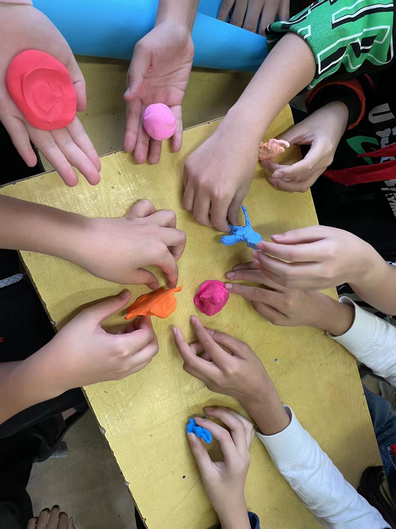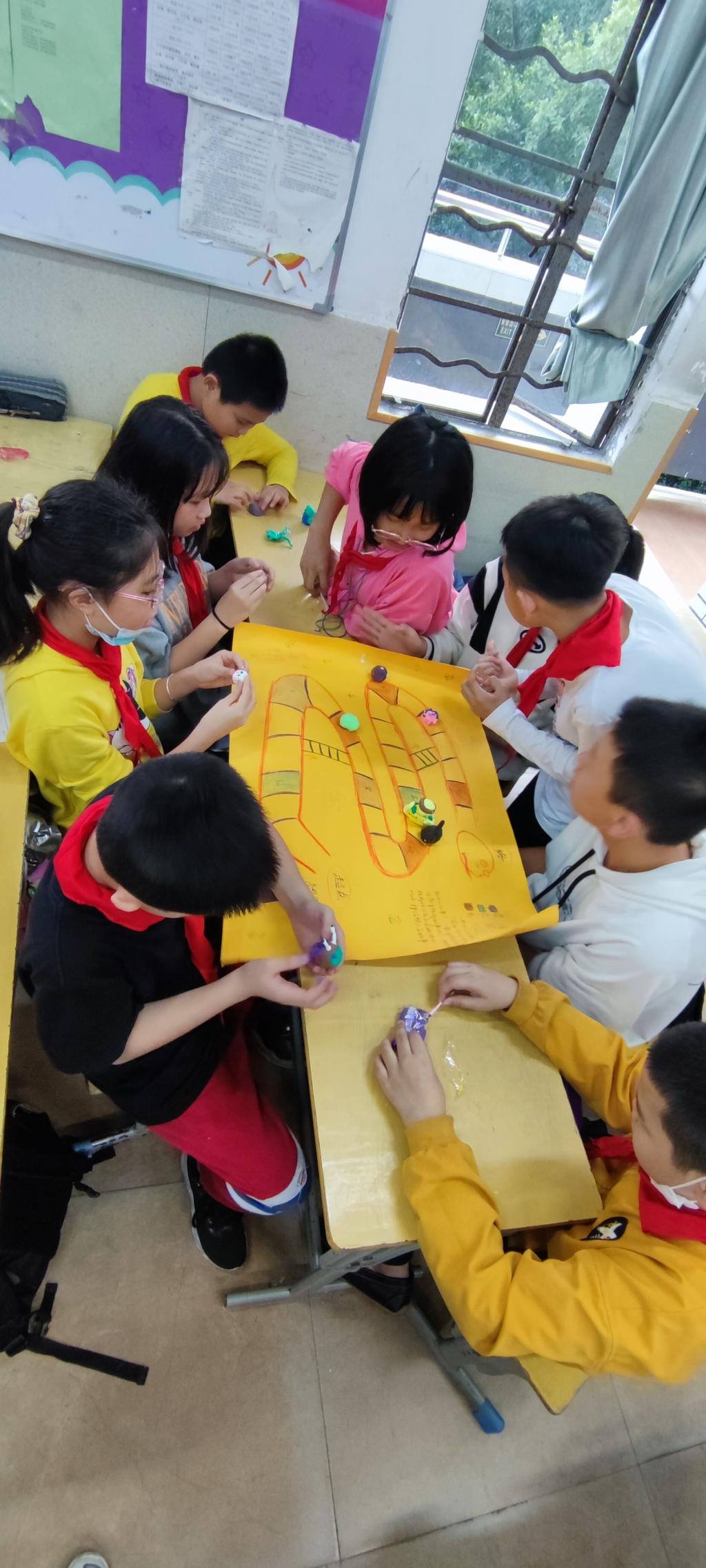 在本次团辅活动中,老师巧妙地设计了几个相环游戏,最终引导出挫折这一小主题。上课铃声响起,活动拉开序幕,就近分完组后,首先进行热身活动“青春抓抓手”,学生都积极参与、活动氛围立马燃起。热身过后,进行黏土创作活动,每个学生在组内认真创作自己喜欢的图案,并开心的与组内其他同学分享其作品。接着利用自己用黏土创作出的图案来当棋子,进行下一环节“披荆斩棘”之蛇形棋大作战的游戏活动,在此活动过程中,学生根据棋盘上的要求,积极分享近期发生的令自己产生情绪的事情,以及分享游戏输赢的心情,从而引导出挫折一词。下课铃声响起,师生拍照留念,此次活动圆满结束。