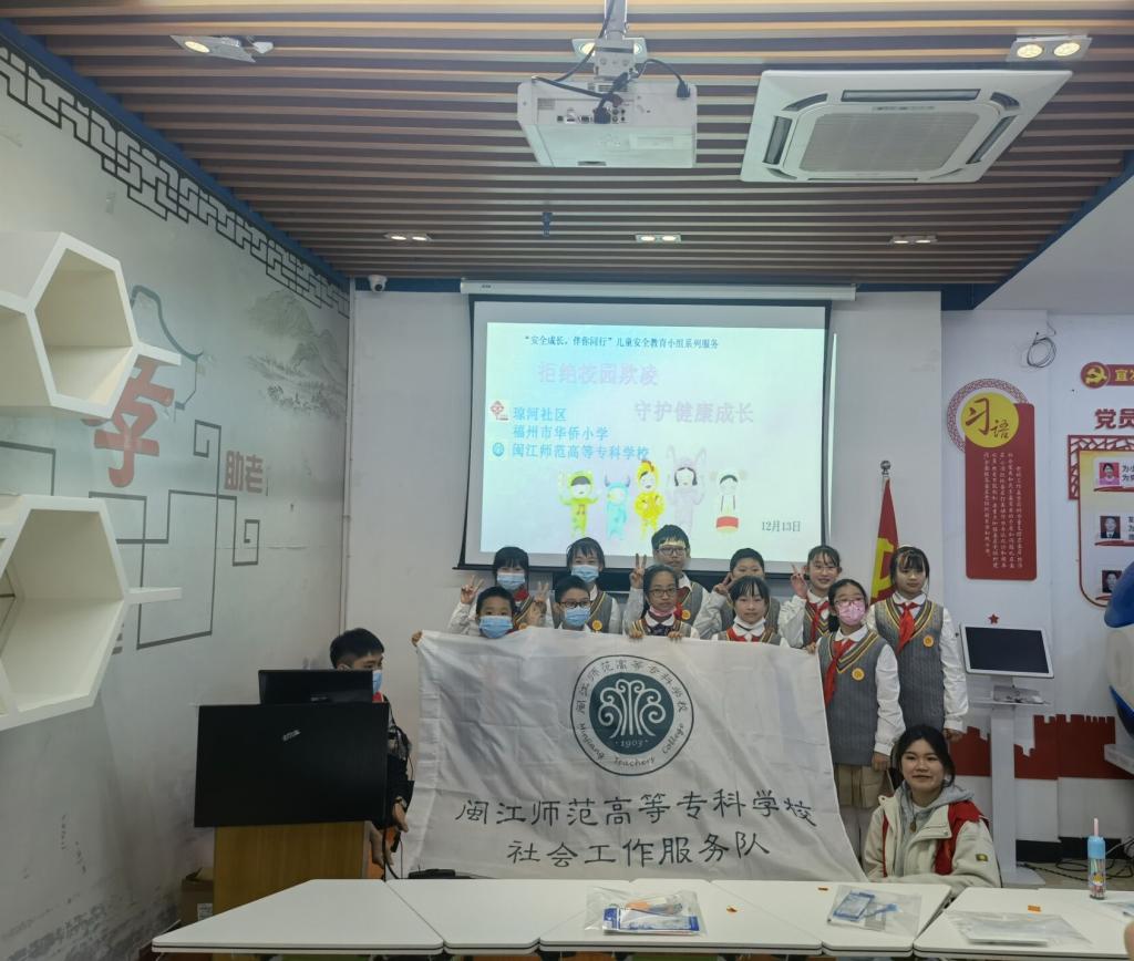校园欺凌可使大家的身心健康受到伤害。校园欺凌不仅直接伤害了我们的身体,还会严重损害我们的心理健康,有些同学由此产生恐惧心理,难以集中精力学习,造成学习成绩下降,有的甚至不能正常完成学业,为了预防和减少校园欺凌事件的发生,提高学生的安全意识和自我保护能力,共同维护和谐的校园环境。闽江师范高等专科学校人文社科系20级社会工作班学生联合福州鼓楼区琼河社区、福州华侨小学为琼河社区辖区内儿童开展“安全成长,快乐相伴”儿童安全教育小组工作系列活动。