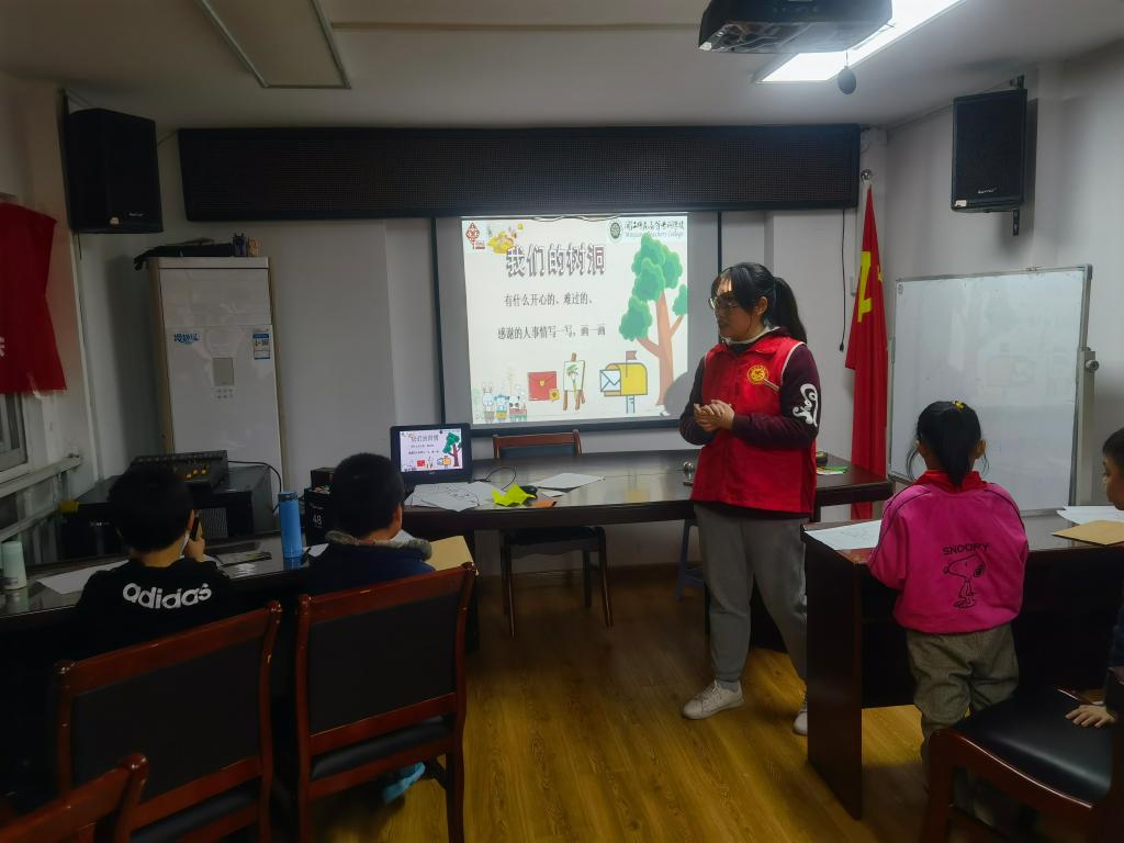 第二次活动以“展童年岁月,鉴朋辈青春”为主题,于2021年12月9日下午开展,由陈星宇担任主持。活动共有4个环节。主持人先请大家用开火车的形式依次进行自我介绍,并引出“什么是宝藏?”的提问开始了第一个破冰游戏“藏匿的宝藏”,小朋友们在指定教室内寻找带有指令的颜色卡片,游戏过程中氛围热烈,调动了小朋友们的积极性。第二个游戏是“镜子的秘密”,小朋友们通过一方抽到卡片上的字表演,另一方进行模仿,猜出是什么心情。让他们了解到彼此的感受与心情,增强对身边人和自身心情的关注的觉察能力。第三个游戏“两人的画作”,一方画完,另一方根据对方口述的笔画顺序作画,游戏合作互动性加强,社工在旁做引导,让小朋友们更加感受到对方是怎样的沟通交流方式以及如何配合对方。最后一个游戏是“我们的树洞”,小朋友们在分发的信纸上写下今天发生的事或者感受,进行了分享,随后主持人总结了本次活动。