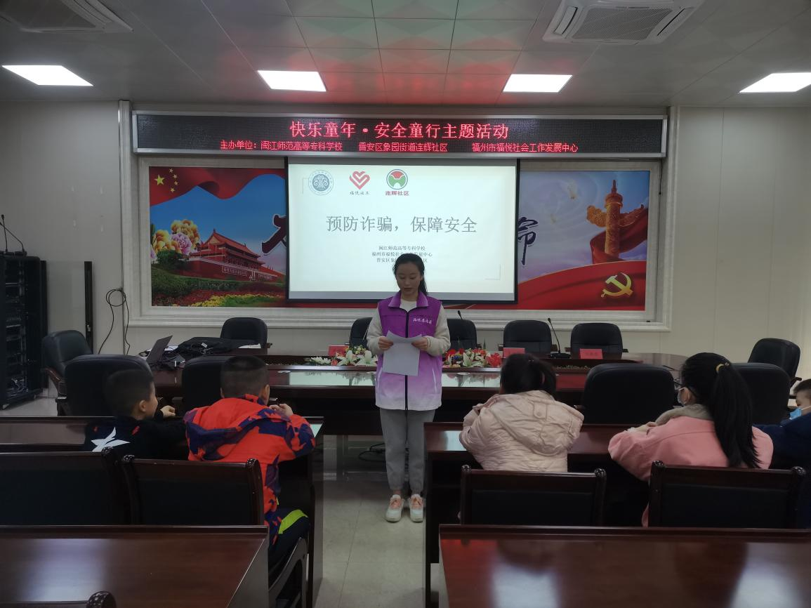 首次活动以“预防诈骗,保障安全”为主题提高儿童的防范意识,提升他们对诈骗手段的辨别能力,于2021年12月4日上午开展。为本次活动在张潇颖老师和黄社工的指导下,由20社工班连辉实训分队策划并参与执行,刘雅珺同学担任主持。