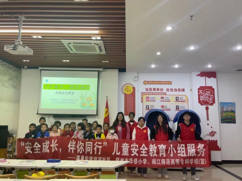 儿童安全教育是学校、家庭和社会的共同责任,为了增强儿童自我保护意识,普及相关安全教育知识,闽江师范高等专科学校社会工作专业联合福州市鼓楼区琼河社区、福州市华侨小学,在专业教师张潇颖和社区工作人员的支持指导下,20社工班儿童安全教育小组在琼河社区新时代文明实践站开展“安全成长、伴你同行”儿童安全教育小组工作系列活动。本次活动以“守护童年,快乐成长”为主题帮助儿童认识性别差异、建立身体界限,提高儿童的防范意识,于2021年12月10日下午开展。活动现场社工专业的同学们和小朋友们相处融洽。活动一共分为五个环节,第一个环节热身小游戏“造反运动”通过做与主持人口令相反动作的方式,活跃了气氛,调动小朋友们的活动积极性。第二个环节“认识性别”以儿童讨论我是什么性别,和别人有什么身体差异为导入,让小朋友们在纸上圈出隐私部位的方式,加深小朋友们对于隐私部位的理解,让小朋友们更好的认识身体,建立身体界限。第三个环节“保护身体”用播放视频及图文的方式引入儿童性侵害相关知识,并通过抢答的方式加深小朋友们对安全知识的认识。引入第四个环节 “情景讨论”,小朋友们和主持人积极互动,达到巩固安全知识的目的。第五个环节“应对方法”让小朋友们知道一些预防方式以及发生事情后的应对方法。活动结束后,五名社会工作专业的同学和小朋友们进行了合影留念,并给小朋友们送上了精美礼物。