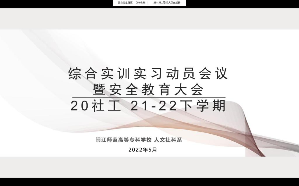 为提高学生专业理论与实际相结合的能力,让学生们在实习中提升自我的工作能力,顽固专业知识和技能,进一步让学生掌握与人相处的技巧,培养自身的协作精神,养成积极的工作态度和良好的工作作风,使学生树立起正确的职业精神,提高学生自身的综合素质,5月15日晚上,20级社会工作班在3号楼504教室开展了“2020级社会工作顶岗实习动员暨安全教育会”活动,社会工作专业张潇颖老师及20级社会工作班全体同学参与了本次活动。采用了线上线下同步进行的方式。