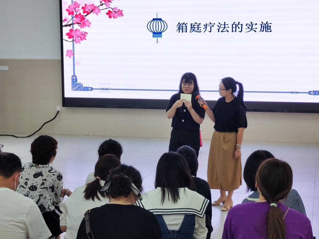 培训过程中,高盖山实验学校吴镔镔老师首先介绍了箱庭疗法的历史和治疗的前提条件。之后,展示了个体箱庭疗法的实施过程以及使用记录表的相关注意事项,为了让教师们对箱庭有更深入的了解,吴镔镔老师引导参加培训的教师们选择三个沙具代表“现在的我”“过去的我”与“未来的我”,共同探讨在选择沙具过程中的感受与体悟。最后,通过分享实际案例,提高教师们对箱庭疗法的应用水平。