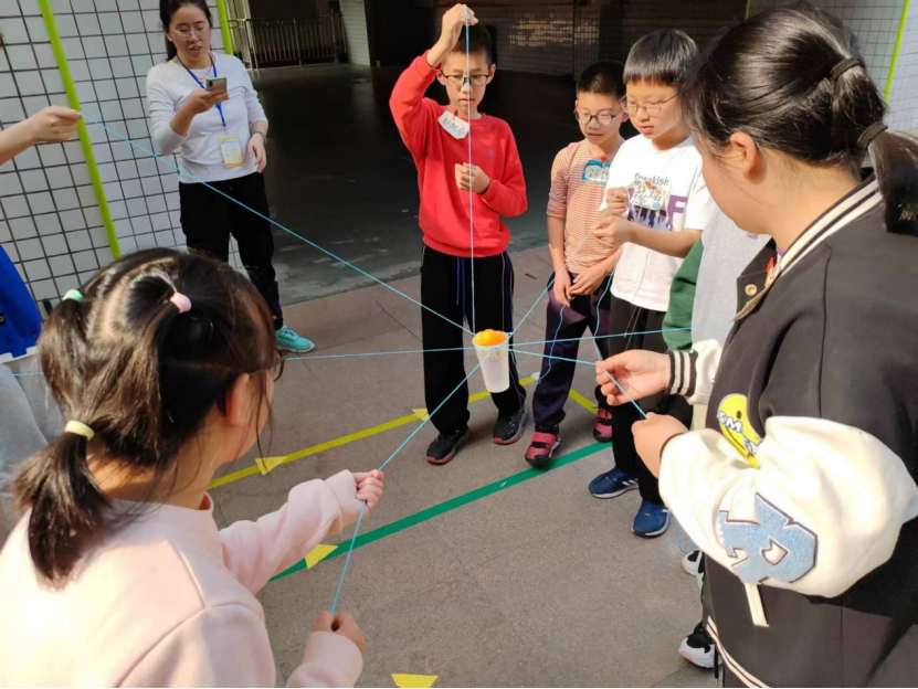 首先志愿者们带领孩子们进行热身活动,每个小组围圈牵手,听指令做出相应动作,随后按要求对指令做反动作,以此训练团体的专注力和团队间配合能力。紧接着,通过团体“抽积木”游戏,体验任务失败的挫折感,并在分享讨论中邀请成员们谈论组员的特点,协商与优化成员的参与“抽取积木”的顺序,以提高全员通关的概率并再次尝试执行。通过活动分享和讨论,促进儿童彼此理解和接纳,也在团体中聆听和照见“客我”,学习在团体任务中互相谅解,减少抱怨,认识团队中的能力短板与优势,协同解决问题。接着,在团体“搬运”乒乓球活动中进一步提升团体创造性问题解决与协作的能力,巩固团体凝聚力。在该活动中,要求小组成员通过绳子操控装水的杯子并“搬运”乒乓球,材料上特地设计遇水易断的绳子,提高任务难度,设置团体挫折的高发性,教会团队成员们通过协商与合作在处境不利的条件下,群策群力,凝心聚力,同舟共济。最后,在活动总结与分享中,孩子们表示面对挫折与困难时,不可逞“匹夫之勇”,要认识到团队合作的重要性,学会信任队友和投入到团体协作中,感受团体抗挫能力和问题解决的创造性得到了明显的提高。