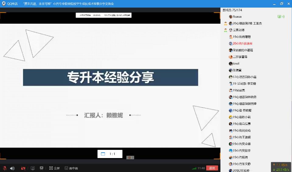 活动开始,谢姗姗老师向大家介绍了本次活动的主题和两位优秀毕业生的成长背景。之后,17级优秀校友赖雅妮就如何升本考入江夏学院的管理专业,以自身经验为例,从备考时间、备考计划、学习方法、学习途径、各科的考试特点及答题技巧等方面进行详细阐述,建议同学们要树立明确目标,要细化出近期的目标与远期的目标;17级优秀校友陈小露,也结合自己考入漳州师范学院的经验,细致地讲解了如何科学备考,是否需要报相关机构、如何学会使用公众号资源、备考保持心态平衡等内容。最后,两位校友面对同学们的疑惑进行了耐心解答,给心理咨询专业的在校生带来干货满满。