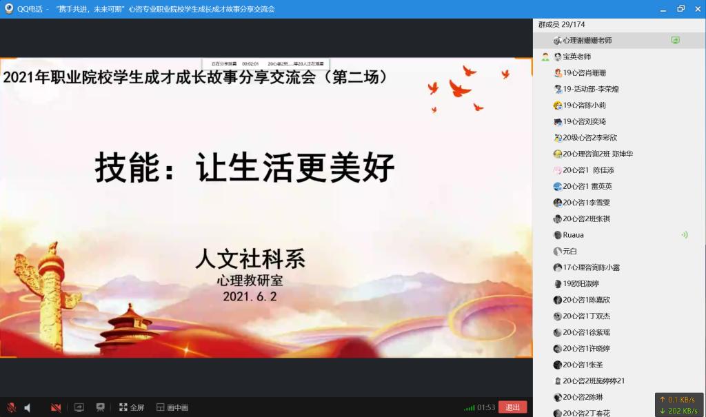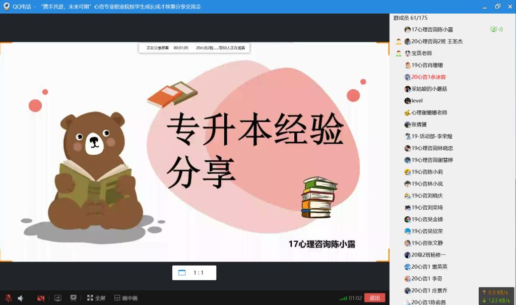 为帮助同学们了解专升本信息,做好未来学习规划,6月2日晚,人文社科系心理咨询专业在线上开展心理咨询专业职业院校成长成才故事分享交流会。本次交流会邀请了17心理咨询专业优秀毕业生赖雅妮和陈小露担任嘉宾,活动由心理教研室主任谢姗姗老师主持,全体19、20级心理咨询专业的师生共同参加。