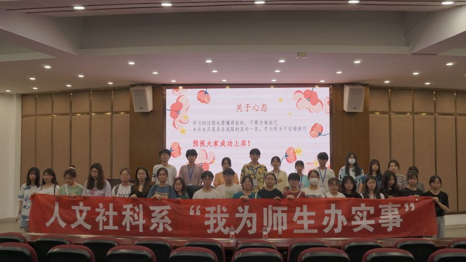 6月11日下午2点,我系于一号楼学术报告厅举办了“我为师生办实事”专升本分享会。此次分享会邀请了专升本成功的18级学生杨淼和沈琼丹来分享自己的学习经验。人文社科系团委书记黄益群老师以及19和20级的同学参与了此次活动。首先,两位学姐介绍了个人基本信息,分享了自身的学习方法,强调一定要合理规划自己未来,对于考试要早做学习计划,紧接着,两位学姐鼓励同学们要树立信心,持之以恒。最后,两位学姐为19和20级的同学们进行解疑答惑,使大家对专升本有了更深一层的了解。此次交流会为迷茫的同学们指明了前行的方向,点亮了心中明灯,大家受益匪浅。