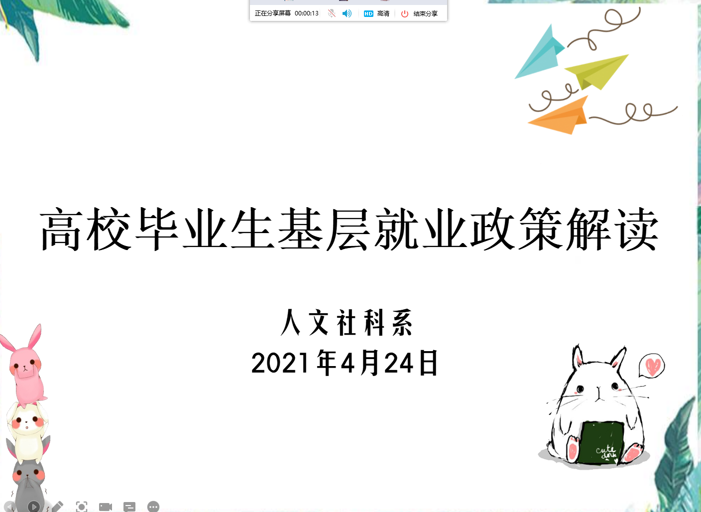 为做好2021届毕业生就业工作,4月24日,人文社科系在线上开展了“高校毕业生基层就业政策解读”专题教育,此次会议邀请了三位参与服务基层的优秀毕业生进行经验分享,会议由叶懿蛟老师主持。