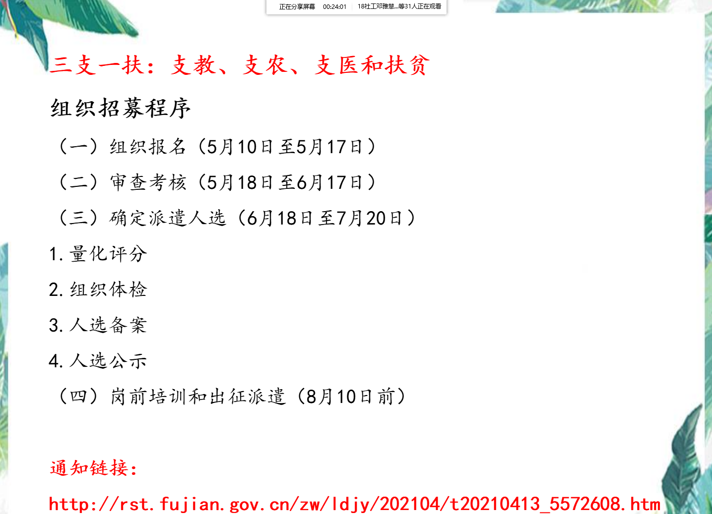 会上,叶懿蛟老师首先介绍了高校毕业生基层就业政策,并对几个项目的报名时间、服务内容、岗位要求等方面进行了梳理。随后,17文秘班童贞贞分享了近一年参加工作的经历和感受,她结合日常的工作内容和福利待遇等方面对“福建省大学生志愿服务欠发达地区计划”进行了详细说明。17社会工作班罗钰琳从“三支一扶”计划的报名方式、报名内容、量化评分表等几方面展开分享。16心理咨询班向吃玉作为2019年的西部计划志愿者,从一名亲历者的角度向同学们讲述了自己在新疆志愿服务期间的点点滴滴。最后,叶老师对本次会议进行总结。他强调,青年大学生要有要有家国情怀和担当意识,勇敢地肩负起当代青年的使命责任,把青春融进国家的发展进程中,扎根大地,服务社会。