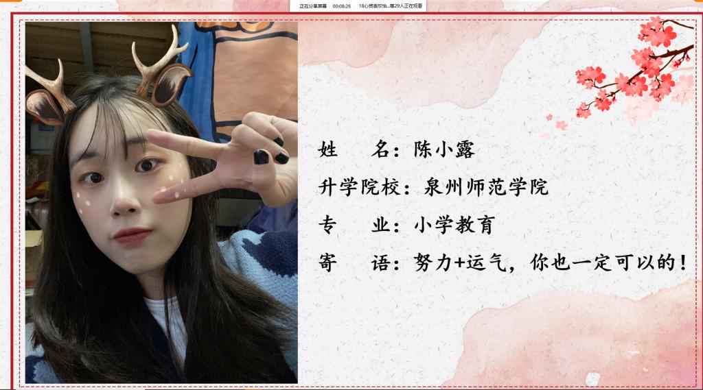会上,两位2017级的学姐结合自己的学习经验,分别从英语、语文、专业课等方面进行了细致的分享。在随后的答疑环节中,同学们积极互动,纷纷向两位学姐进行提问,学姐针对同学们的提问,逐一耐心解答。最后,叶老师针对此次交流分享会进行了总结,他谈到,在学习中要充分利用好时间,注重方法高效复习,夯实基础稳步推进,放平心态不骄不躁,要根据自身情况制定学习计划。