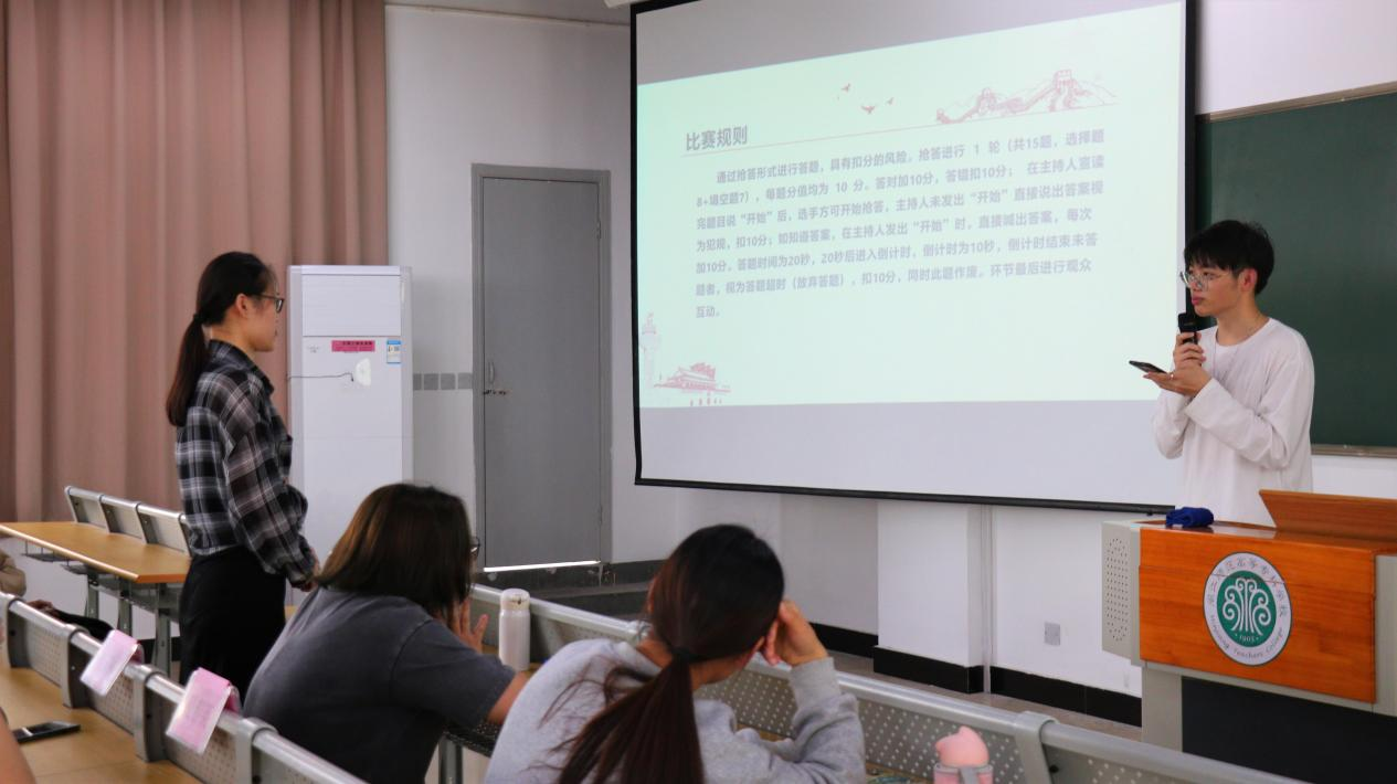 为庆祝我们党百年华诞,回顾党的光辉历程,提升广大学生党性修养与政治觉悟的同时,弘扬红色经典文化,提高人文素养和道德情怀。人文社科系于4月23日采用线上答题的形式进行了初赛,通过成绩排名决胜出前六名选手进入决赛;4月29日在仓山校区3号楼404教室举办以 “学党史践初心,迎百年担使命”为主题的知识竞赛决赛,此次红色诗词竞赛由主持人刘明昊精彩的开场白拉开了帷幕。