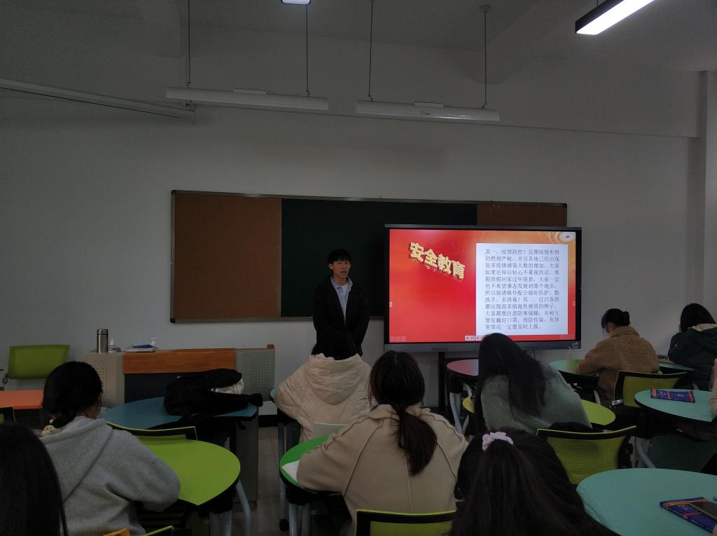 班会开始,由班长讲了关于诚信考试和安全教育方面的知识,通过一些事例为同学们讲解了诚信考试对自己和对他人的重要性。也通过一些小故事,让同学们学到了很多安全知识,并认识到在疫情防控期间,要时刻保持警惕,在外佩戴口罩的重要性。班会过程中,黄清婷同学主动站起来补充发言,使同学们更加深入了解疫情防控的方法与技巧。通过学习相关安全知识,使同学们了解了诚信考试的重要性及生命的可贵。最后,班长总结并呼吁同学们从自身做起,注重生活细节,注重个人卫生,更好地将病毒防控到位,做一名健康文明的好青年。
