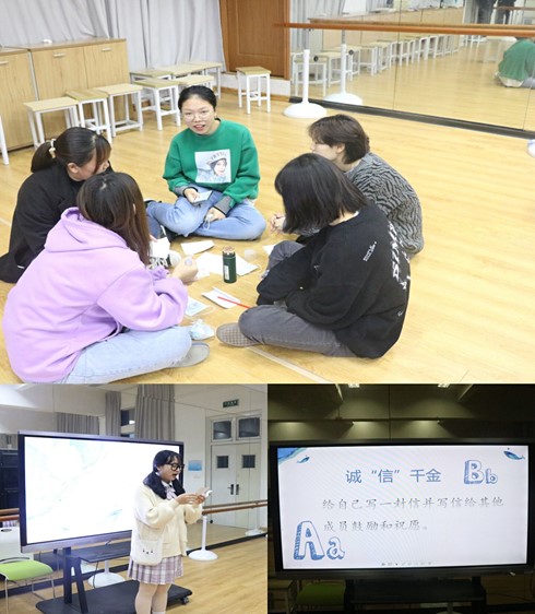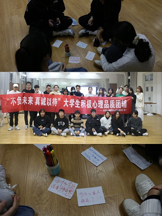 首先大家通过“棒打薄情郎”环节,通过顺时针喊名迅速熟悉了彼此的名字,之后领导者带领大家进入“目光炯炯”环节,要求大家两两对坐,互相喊出自己的优点,同学们起初都略显羞涩,但随着活动的推进大家都更加投入,在这个过程中大家进一步了解了自己以及团队成员,加深了对“自我”概念的认识。之后在“百思得解,前程似锦”环节中,各个成员都提出了自己的困惑,其他的成员给予相应的建议及看法,通过讨论大家彼此有了更深入的了解,也更加信任彼此。活动最后,各个成员为自己或者在场的其他成员写了一封简短的书信给予最真诚的祝福。