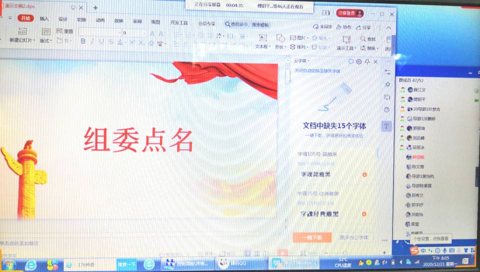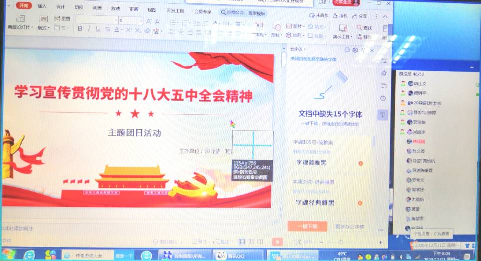 为了让同学们学习宣传贯彻党的十九届五中全会精神,了解此次五中全会的重要内容,践行五中全会重要精神,20级导游一班于12月19日19:00时在线上开展主题团日班会“学习宣传贯彻党的十九届五中全会精神”。此次活动由20级导游一班团支书唐江文主讲。