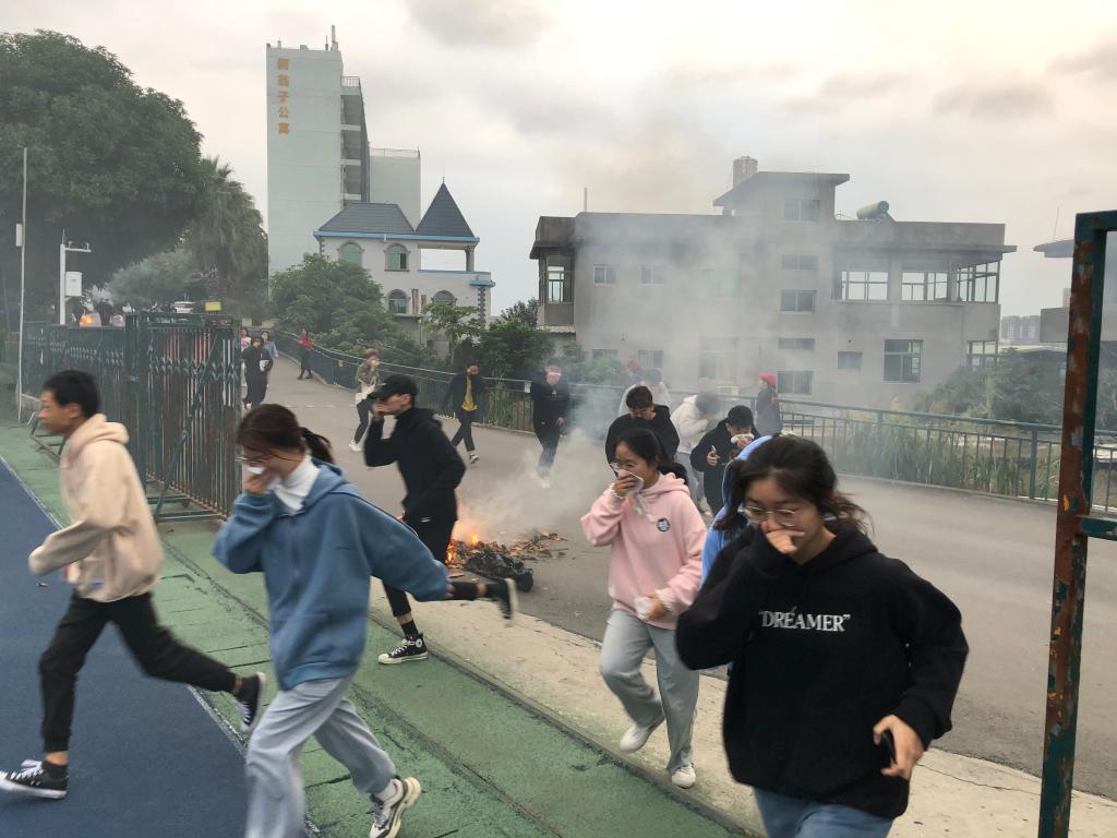 本次活动包括:“模拟火情”、火灾应急疏散、扑救初起火灾、学生逃生、讲解灭火器知识,实际操作灭火器。上午主要为火灾应急疏散演练,下午为扑救初起火灾演练。火灾应急疏散演练流程大致为(1)防火常识教育,演练前,由各部门组织师生学习火灾应急疏散、自救互救等防火安全常识。(2)火灾即将发生7时分预先警报响起。听到预先警报后,停止一切教学活动,各岗位人员迅速就位。(3)火灾正在发生,7时10分火灾警报响起。听到火灾警报后,辅导员、宿管和保卫老师组织本宿舍学生按照疏散路线图有序地疏散到安全区域。
