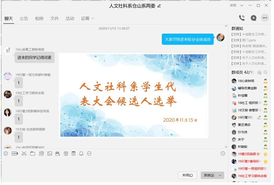 2020年11月15日,闽江师范高等专科学校人文社科系成功举办首次线上学生代表大会选举大会。会议主要通过以群屏幕共享的形式进行,由19行管1班林意端同学主持,系两委全体同学参加。