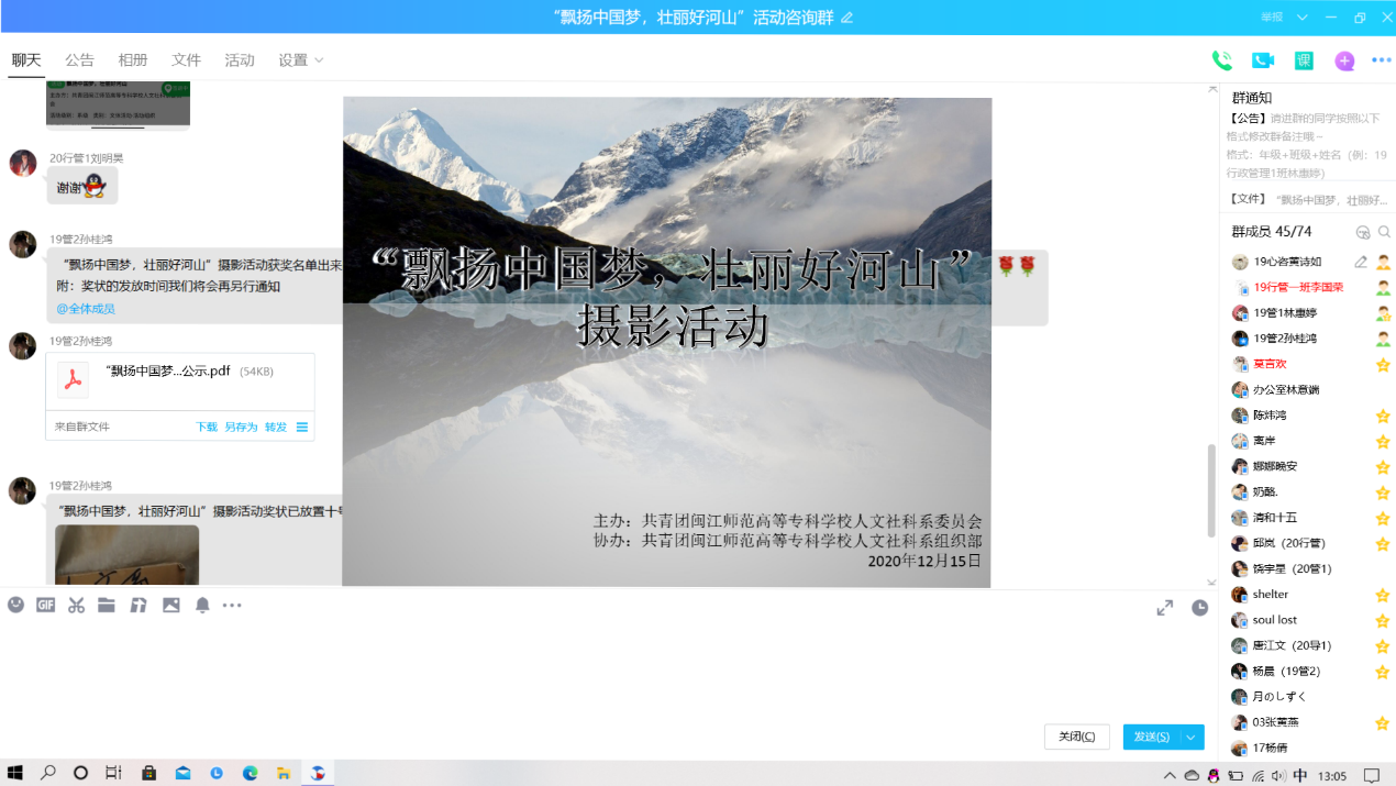 本次大赛,作品征集时间为11月30日-12月9日,作品题材不限。作品征集阶段,不少学生对此次比赛表现出极大的兴趣,全校青年学生积极的投出通过自己摄影镜头记录下祖国的人、事、物,多角度展现摄影作品新颖、独特,各具特色。大赛邀请老师们担任此次活动作品的评委,并通过人文社科系微信公众号及各班班长在班级内宣传本次活动,大赛期间共收到42份作品,最后通过公平、公正、公开的方式,分别评出摄影照片作品6份,视频作品6份。