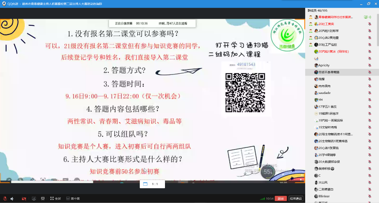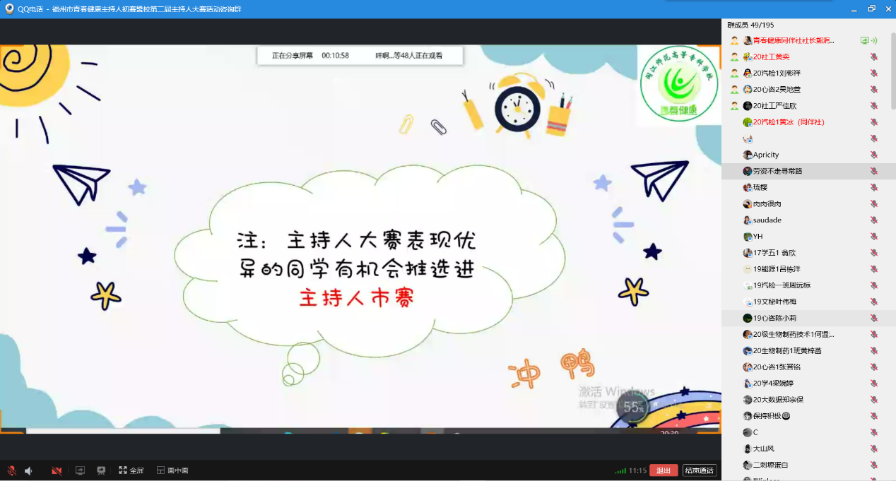 本次主持人大赛培训活动在线上QQ会议进行。首先,主持人介绍了向同学们的主持人大赛的基本流程与规则,并表示,今年将从此次大赛中推选出优异的同学进入主持人市赛。最后让同学们提出问题和不明白的地方,让各位参赛的同学提完问题,主持人进行答疑解惑,为大赛的举办建立了基础。