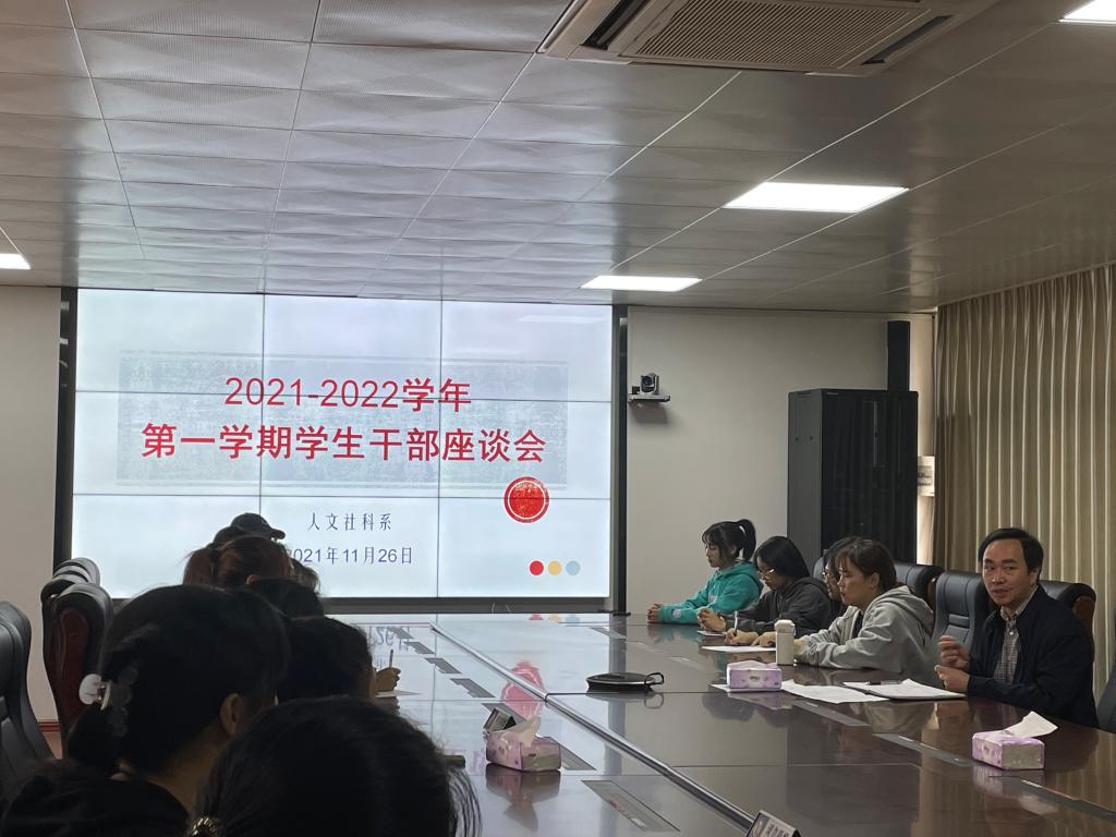 为进一步提高学生的教育管理水平。11月26日上午,人文社科系于海口校区行政楼二层会议室成功召开了人文社科系第一学期学生干部座谈会。出席本次大会的有人文社科系党总支书记洪书源老师、人文社科系海口校区21级辅导员周海英老师、人文社科系海口校区综合科干事王颖秋老师以及人文社科系海口校区21级各班学生干部。