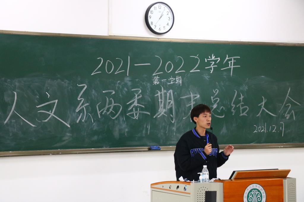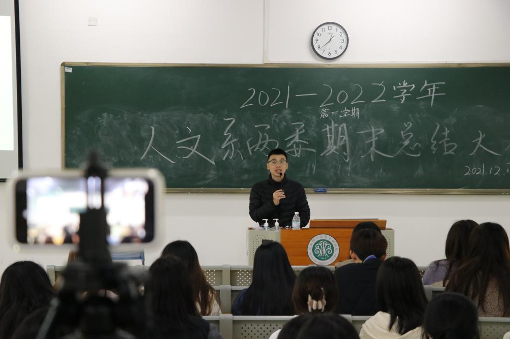 会上,陈少霞老师首先简要说明本学期系两委的工作概况,并对全体成员的努力付出表示肯定及鼓励。叶懿蛟老师着重向21级拟用干事提出努力学习、认真备考的要求,也期望大家在之后的工作学习中同样保持初心热情。叶佳媚老师肯定新成员的加入使活动得到质量性与原创性的发展,为人文系带来了更加充满朝气的精神面貌。三位老师都从不同角度为系两委工作提出相关建议。随后,主席团六名成员依次上台发言,他们对各自分管部门进行客观公正总结,从“学了什么、做了什么、反思不足”三个方面对本学期的工作做出分析。最后,学生会执行主席程宏翔进行了精彩的总结发言,鼓励各个部门继续加强配合,为推动系两委发展贡献力量。