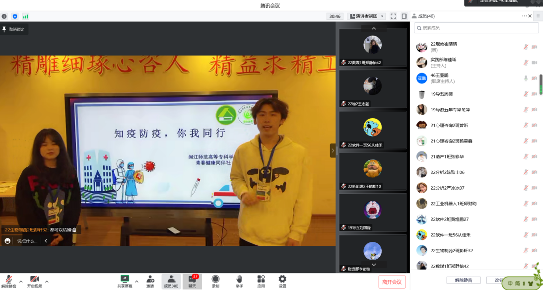 为提高同学们对疫情的防范意识,引导学生主动防控,共同预防疫情在校内蔓延,我校青春健康同伴社于11月16日在腾讯会议开展了以“知疫防疫,你我同行”为主题的活动,第二课堂学员和同伴社成员共同参与。