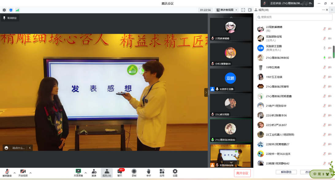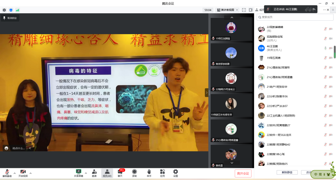 本次活动由青春健康同伴社实践部陈佳瑶和王亚鹏主持。活动开始两位主持人通过“疫情下的你我他”快速联想和疫情知识问答环节,初步了解了学员们对疫情的想法和知晓程度,并通过解释答案传递正确的疫情知识。在科普环节中,主持人向学员们解释“新冠”的病毒特征、发病表现、传播途径等知识。随后向学员们提问并邀请学员参与互动开麦回答,结合学员的回答,主持人讲解了正确防疫的做法。同时加深学员们对“新冠”的认识。最后,两位主持人播放相关视频,观看完毕后,鼓励学员们在评论区或开麦发表感想,强调防疫是社会担当的体现。