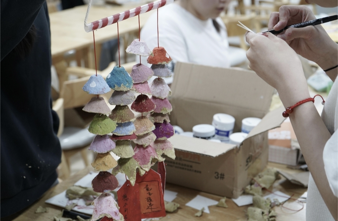 本次活动倡导低碳环保、废物利用的理念,作品所需的制作材料由同学们自行携带,利用硬纸板、塑料品、干花、秸秆、棉线、塑料瓶等废旧的材料,通过巧思、创意、想象、裁剪、描绘、重组等方式赋予废品新的生命,创造出许多匠心独运、别出心裁的手工作品。其中,优秀作品《风铃》的主要制作材料是常见的生活垃圾——鸡蛋隔筐,参赛选手将其裁剪成所需要的风铃局部形状,依据不同风景对每个鸡蛋托进行绘画,用红绳衔接,挂上附着兔年吉祥、学习进步等祝福语的字符,最后进行整体拼装,将其打造成为精妙绝伦的手工作品。此次活动受到人文学子的广泛喜爱与积极参与,活动现场收到个人、团队作品共31份,经过评审老师筛选后最终共有14份手工艺品入围此次活动优秀作品。