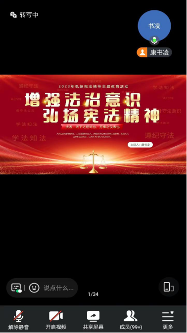 为进一步提高同学们的法律意识,引导大家深入了解宪法、尊崇宪法精神,增强法治观念,推动校园法治文化建设。12月3日,人文与管理学院23级各班分别于线上腾讯会议、3-403教室和2-605教室开展了“增强法治意识,弘扬宪法精神”主题教育活动。本次活动分别由陈少霞老师、康书凌老师、叶懿蛟老师和陈佳榕老师主持,23级全体同学参与。