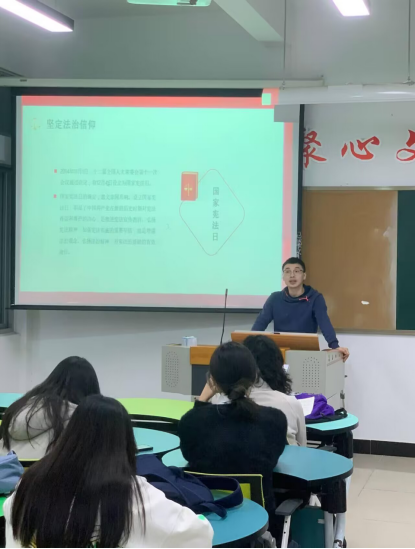 活动上,四位老师首先就一些基本法律知识与同学们进行了交流互动,再向同学们讲解了我国的宪法;接着,通过理论联系实际的方式,运用生动鲜活的案例和幽默风趣的语言为同学们讲了我们在日常生活中应该怎样坚定宪法自信、坚定法治信仰和维护宪法权威;重点介绍了我们应该如何遵纪守法、远离不良行为,为建设法治中国贡献自己的一份力。在活动最后,四位老师对本次活动做出总结,号召同学们要懂法、知法、守法,自觉弘扬宪法精神,做全面发展的当代新青年。