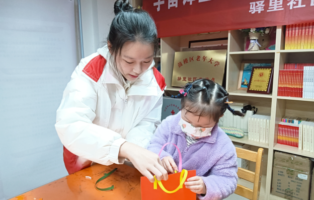 图2:志愿者帮助小朋友制作手工包包