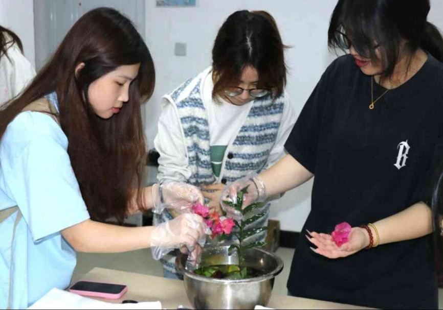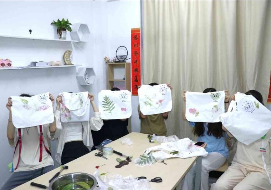 活动伊始,工作人员结合劳动教育内涵,讲解植物拓印技艺的起源与发展,从古代匠人捶草印花智慧,到现代非遗技艺传承,生动诠释"劳动创造美"的文化内核。在实操环节,同学们以宿舍为单位分工协作,挑选叶片花瓣、设计图案、敲打固色。接着,一件件散发着草木清香的拓印作品,见证着青年学子对劳动之美、自然之美的深刻体悟。