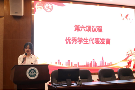 颁奖仪式过后,优秀学生代表曾宝翎同学上台发言。她号召我院学子要点亮青春理想,树立正确“青年观”,与时俱进,把握世界发展规律,用发展的眼光看问题。
