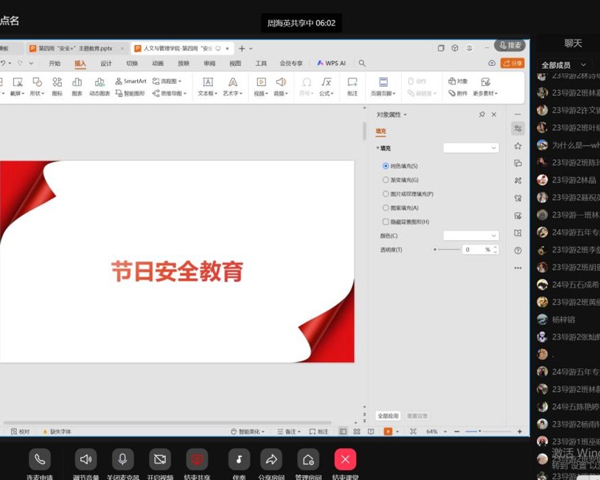 为增强学生安全意识,确保大家度过一个平安、欢乐的假期,9月27日晚,人文与管理学院在仓山校区、福清校区同步组织全体学生,通过线上线下相结合的方式,集中开展了中秋国庆假期安全教育活动。本次活动由各年级辅导员主讲,全体在校生共同参与。