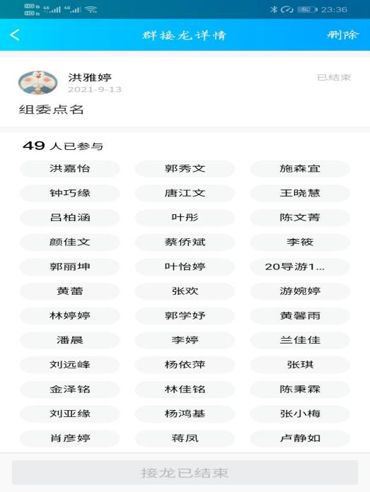 活动前期由团支书唐江文针对本次团日活动的开展同班委进行了讨论。本次线上活动流程首先由组织委员洪雅婷在班群发起群接龙签到,接着由文娱委员郭丽坤线上分享团歌,紧接着团支书组织大家线上观看“习近平总书记“七一”重要精神讲话”宣传片,同学们踊跃在班群发言,并且认真分享自己的感想,然后开展了线上诗歌朗诵和组织同学们开展了游戏环节,最后由组织委员洪雅婷再次发起群接龙签退。