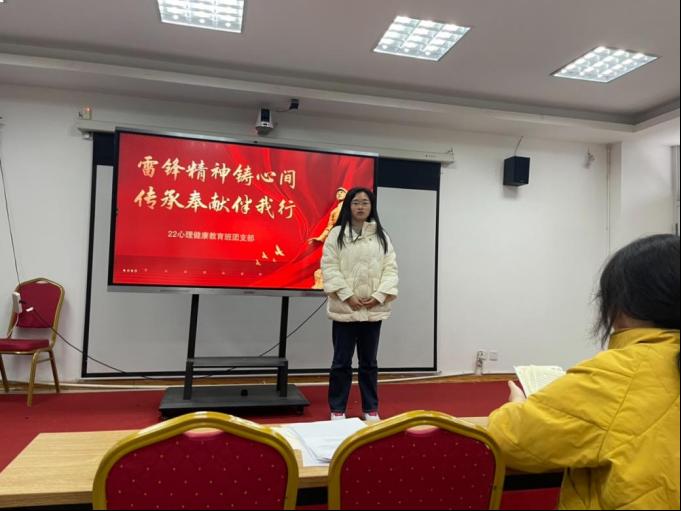 22心理健康教育班团支部主题团日活动在嘹亮的团歌中拉起帷幕。文娱委员黄宇霖带领全体支部成员唱响《光荣啊,中国共青团》,组织委员紧接着对支部成员进行点名。由团支书王一棉对精心制作的ppt进行了深入宣讲,她详细地阐述了起源、名言以及时代价值,并且与同学们开展雷锋相关问答。同时邀请了支部成员上台分享观看雷锋系列报道的所思所想,支部成员蔡鑫表示雷锋精神永不过时,要深刻把握雷锋精神的时代内涵,勇于奉献,以更加饱满的热情和更加扎实的行动贡献出自己的一份力量。