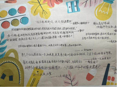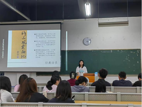 活动伊始,团支书叶晓瑜同学以当代先进青年的故事,带领同学们领略了新时代青年在各领域践行五四精神,为国家发展建设发光发热。在接下来的师生读书分享会上,我们有幸邀请到了白丽老师参加。活动中,团员孙思淇同学向大家们介绍了余华的作品《许三观卖血记》。这本书叙述了解放初期,主人公许三观因生活所迫,不得不通过卖血来维持生计的故事,最终他因一场大病而告别人世,走完了自己的生命历程。此故事讽刺了当时的社会环境,启示了我们对生命意义的思考。随后的创意经典名句分享同学们纷纷在在纸上写下印象最深的名句,大家一起探讨与交流活动心得。