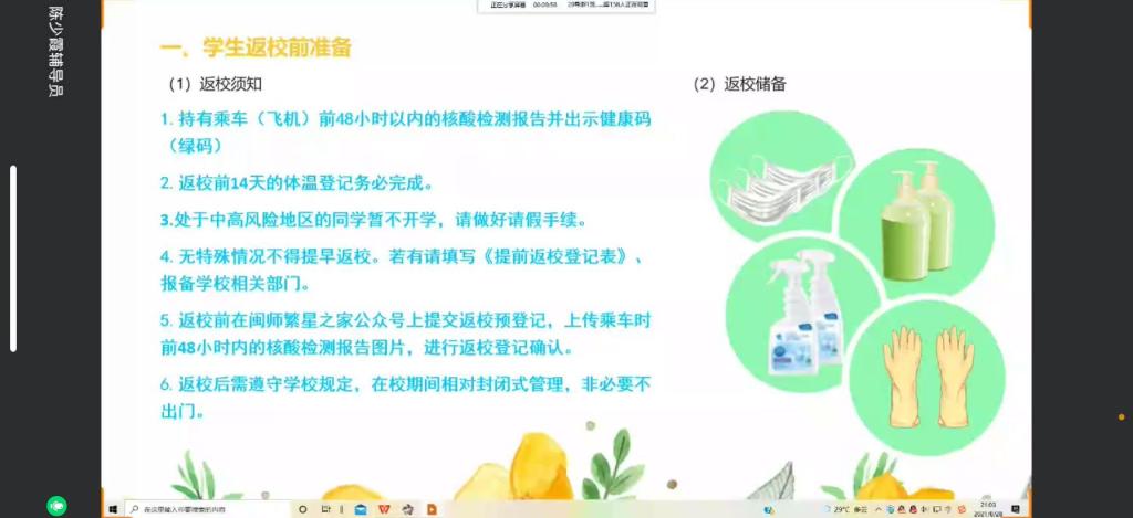 为确保每位同学能够安全返校,8月27日晚,我校人文社科系2020级辅导员夏春英和陈少霞老师在线上开展了以“疫情防控 人人有责”为主题的线上会议,给大家详细讲解返校前的疫情防控准备工作及其相关防疫要求。