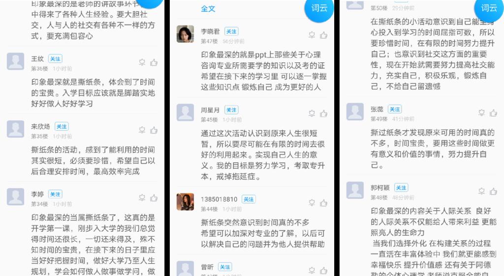 首先,翁洁老师带领大家开展了“生涯量量看”活动,通过按照指领逐次撕纸条的过程,让大家体会到每个人需要用有限的学习时间去为自己未来赢得养活自己、体现个人社会价值的筹码。同学们都产生了时间紧迫感,感叹时间宝贵,表示自己应该好好规划时间,制定好大学的学习目标。接着翁老师教导新生们,大学生入学需要完成三个重要的学习目标:做人、做事、做学问,成为一个成熟正直、积极向上而有责任感的社会人,成为一个懂做事、能做事,做成事的有用之人,成为一个好学、好问、专注做学问之人。