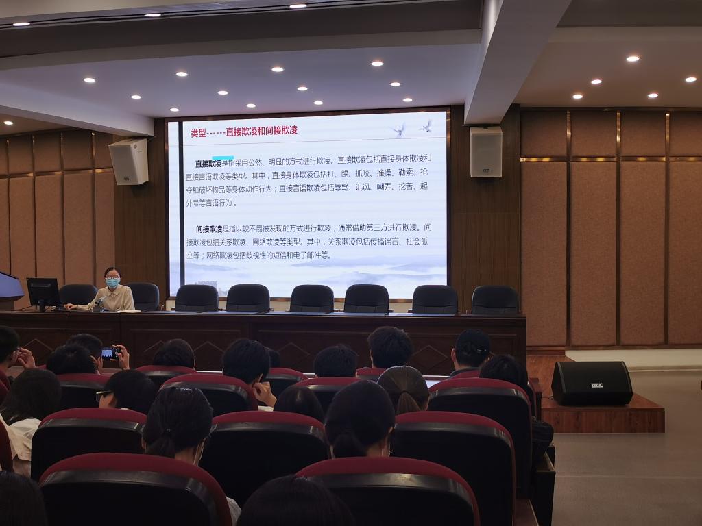 为响应学校开展的防治校园欺凌专项行动,更好地建设大学生的校园环境,增强大学生的价值观塑造,引导其树立正确的社会主义核心价值观。10月24日晚19:00,我校人文社科系2020级辅导员夏春英和陈少霞老师在仓山校区图书馆三楼多功能报告厅开展了以“丑拒”校园欺凌为主题的防治校园欺凌教育活动。